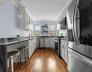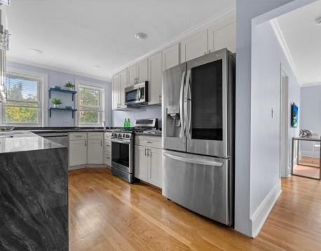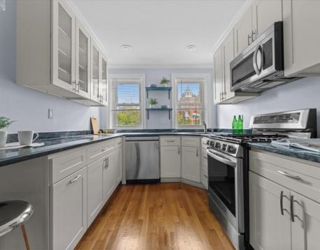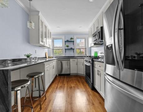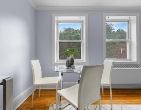 Top floor corner one-bedroom condo with parking, near Forest Hills T. This rare find offers modern updates and a generous layout. The bright, wide galley kitchen boasts sleek LG appliances, ceiling-height cabinetry, black granite counters, and recessed lighting. Sip morning coffee at the dining nook. Spread out in the 200 sq ft living room, spacious for both a dining table and workspace. The 120 sq ft bedroom gleams with corner light. And the refreshed bathroom offers stylish tiling. Interior storage includes three hall and foyer closets. The association is reviewing options to install a new cooling/heating system with in-unit control. In the basement, find private and bike storage, and a laundry room. Park anywhere in the complex with your pass. Surrounded by green space, escape into Franklin Park trails and Arnold Arboretums' treescape in just half a mile. Blocks to Forest Hills Station, Southwest Corridor bike path and Brassica Kitchen.