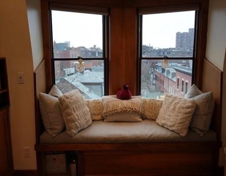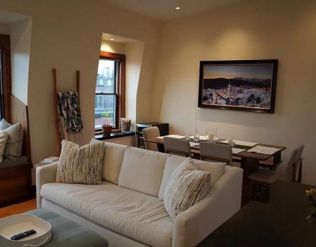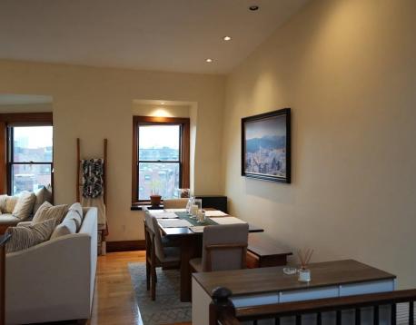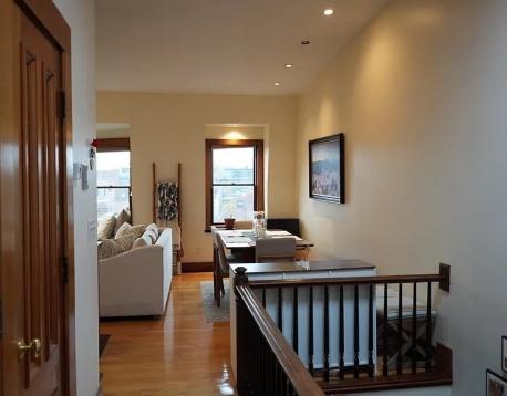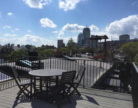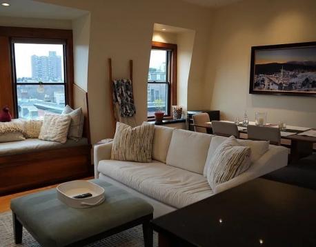 Available 3/1. Gorgeous South End penthouse offering both a private balcony and a roof deck (ladder access) with sweeping city views and unforgettable sunsets. The sun-filled open living area features soaring ceilings, a decorative fireplace, skylights, dramatic gabled windows, custom built-in storage, and cozy bench seating. The thoughtfully designed kitchen features granite countertops and stainless steel appliances and flows seamlessly into the living space, ideal for both everyday living and entertaining. Additional highlights include central air conditioning and in-unit laundry. Both bedrooms offer excellent closet space. The private balcony and ladder access to the roof deck is accessed through the smaller bedroom, currently used as an office. This bedroom is wide enough to accomodate a full or queen sized bed, or a pull out sofa/futon and desk. This is a lease break listed for less than the current tenants are paying, rent will escalate to $4400 on 9/1/2026.