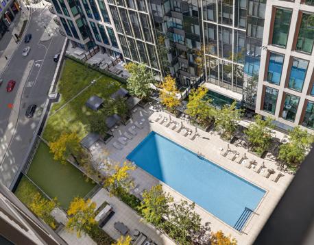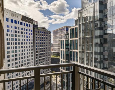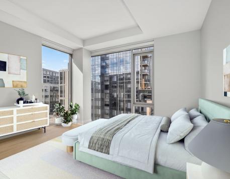 This luxurious residence offers refined city living on the 19th floor of Echelon Seaport. This stunning 2-bedroom, 2-bathroom condo spans 1,168 square feet with an open floor plan ideal for relaxation and entertainment. Floor-to-ceiling windows in the living room, complemented by a tray ceiling, fill the space with natural light and frame captivating city views. The kitchen features a peninsula, custom Italian cabinetry, and Bosch appliances, flowing into the living room and private balcony overlooking the Grand Pool and Courtyard. The well-lit bedrooms and spa-like marble bathrooms add luxury.Residents enjoy one garage parking space and access to over 50,000 square feet of amenities, including indoor and outdoor pools, a fitness center with a basketball court, golf simulator, and yoga studio. Social spaces like a fireplace lounge, private dining room, and outdoor terraces enhance the experience. Services like 24/7 concierge and doorman ensure comfort and convenience.