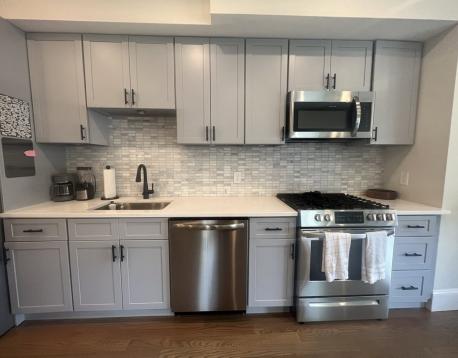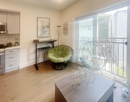 AVAIL 1/1/26: Just bring a suitcase to this 1BR second floor 2020 gut renovated floor through Condo Building! Open concept space features HW floors, high ceilings, Juliet balcony, NEST thermostat, custom blinds, video intercom and keyless entry. Kitchen is equipped w/ stainless appliances, solid surface counters, and slide in gas stove. Box windowed bedroom is charming with brick accent wall, in unit laundry closet, and walk-in closet w/ custom closet systems. Bathroom is elegant with marble tiled shower, double sink vanity, and linen built in. Great storage. Available partially furnished- ask about what items can remain! Three blocks to Airport T for a 10 min commute to downtown, and Greenway! Blocks to restaurants, groceries, shops, green space, fitness, cafes & miles of waterfront amenities- perfect for someone who needs to be close to airport! Sorry, no pets. First, security required credit 680+ and verifiable income. All internet/utilities included!
