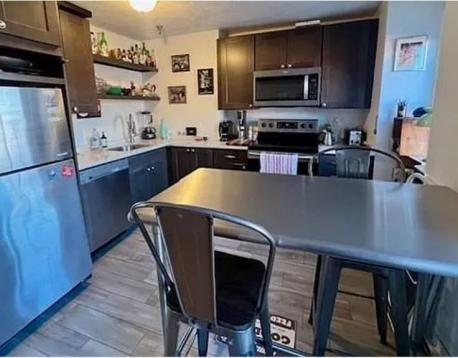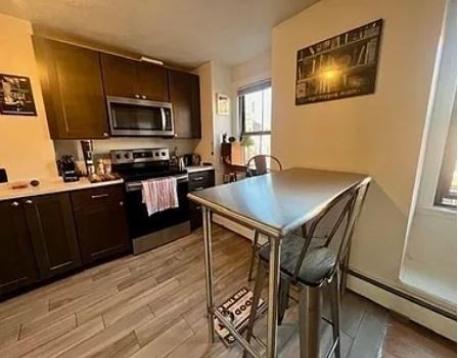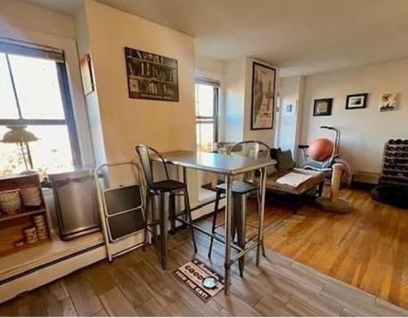 Live on the Best Street in the South End. Picturesque Hanson Street just steps to Tremont's restaurant row, Beehive, Picco and so many more.. This classic Brick building features a top floor unit that is a floor through and gets great light from both the front and rear of the building as well the skylights with tall ceilings brining Sunlight all day. Open Kitchen/Living room combo overlooking Hanson Street. Renovated kitchen with updated shaker cabinets, quarts countertops and stainless steel appliances. Large Primary bedroom with good sized closet and 2nd bedroom that is smaller and great for a home office or 2nd bedroom. Hardwood floors throughout. Heat & Hot water included in the rent! Common laundry in the basement and a shared large back patio. Cats ok, sorry no dogs.
