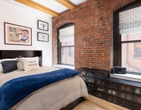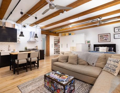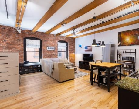 Affordable modern NYC loft style Junior 1 Bed condominium with 1 off-street parking space located in the desirable Fort Point Channel area of the Seaport. The high ceilings, large windows, exposed brick walls, timber columns and ceiling beams give the wide open space a flexible floor plan with distinct character and lots of architectural detail! The hardwood floors, high end stainless steel kitchen appliances, deep farmers sink and sea glass/stone countertops are the perfect complement to this trendy urban loft style unit. Tall custom designed wardrobes provide ample storage capacity and creates a sleeping area of distinction and privacy within this airy interior space. The multipurpose luxurious bathroom has a deep tub, shower, large washer and dryer and a complementary wall of storage cabinets, shelves and drawers that will help keep this room neat and organize. Lastly, enjoy the comfort of central a/c and the convenience of an elevator building!