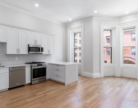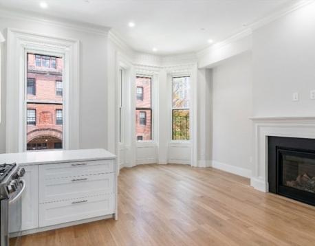 Complete Brownstone Renovation in 2023! Luxury Back Bay residence with 12' ceilings, condo quality finishes, and architectural detail. Perfectly located between Commonwealth Ave and Newbury St. 1400sf 2BR/2BA Upper Duplex with a stunning kitchen / living area with gas fireplace and original mantel. Bay window and breakfast bar provides views of Newbury Street. Kitchen features gas cooking, full quartz countertops with LED backlighting. Private Laundry, Central A/C and 4" white oak flooring throughout. Custom closets, extra storage. One of Two Grand Residences in the building - Available June 1.