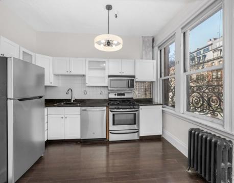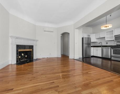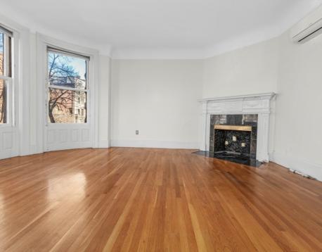 This bright, front-facing one-bedroom, one-bath apartment in the heart of Back Bay is located on the second floor of a classic brownstone and beautifully combines historic character with modern updates. The open kitchen is equipped with a gas range and large windows overlooking Beacon Street. The generous living area features 10-foot ceilings, a decorative fireplace, and hardwood and tile flooring. The bedroom offers excellent storage with three closets and en-suite bathroom. Ductless air conditioning provides year-round comfort. Residents also enjoy access to a common roof deck with stunning views of the city skyline and the Charles River. Heat and hot water are included, and laundry is available in the building. Unit was just painted.