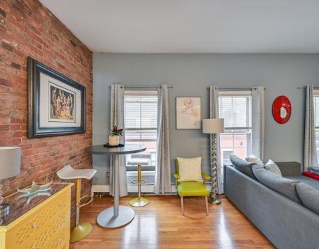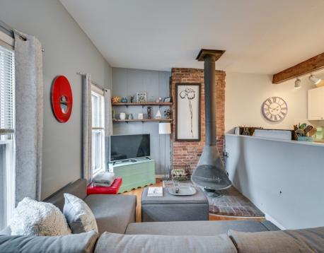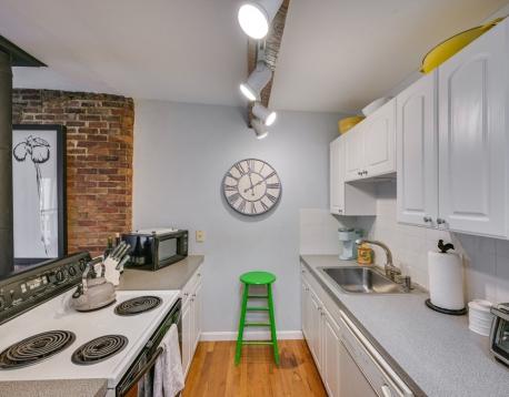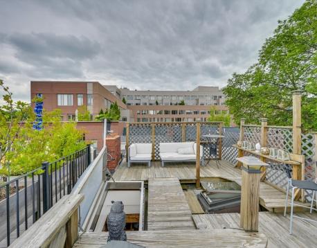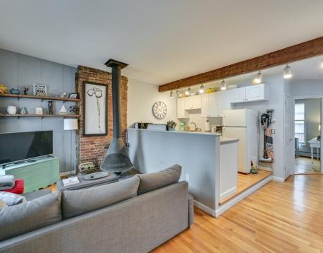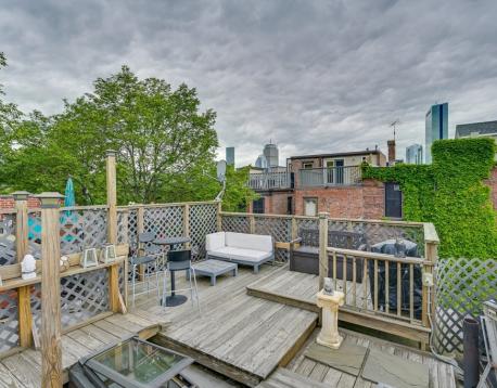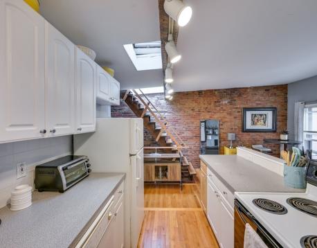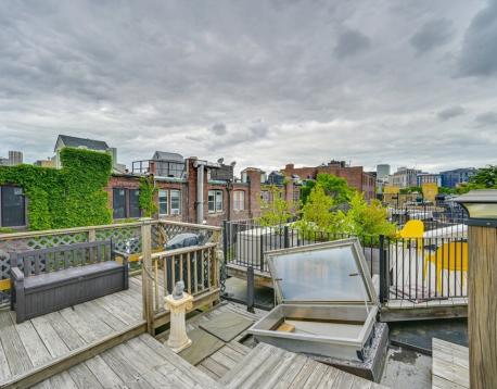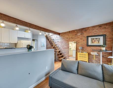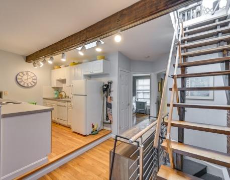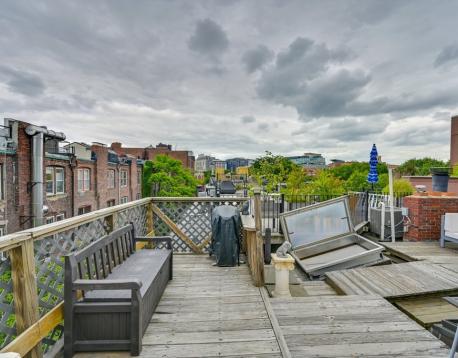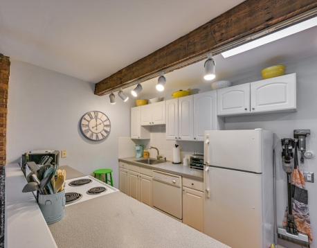 This well-maintained 1 bed 1 bath penthouse offers 600 square feet of charming living space. The unit features an inviting living area with a distinctive beamed ceilings and a decorative fireplace. The kitchen is thoughtfully designed with a stylish backsplash, a versatile peninsula, and a skylight that provides ample natural light. The home also includes a spacious bedroom and a modern bathroom equipped with a tiled walk-in shower. Additionally, a standout feature of this penthouse is the private deck, which offers an excellent outdoor retreat with panoramic city views. The property is available for lease starting May 1.