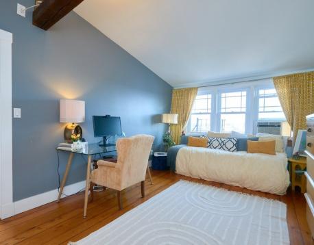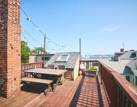 Spacious and airy two bedroom penthouse duplex. Occupying the top two floors of a three unit building, this home offers beautiful wide plank pine floors and great natural sunlight. Large private deck with water views is off the renovated kitchen with granite counters, stainless appliances, gas cooking and breakfast bar. The dining room is flanked by 2 fireplaces with original marble mantels, and a wall of built-in shelving for gorgeous displays. Two well-sized bedrooms with vaulted ceiling are located on the top level with Boston skyline views and original beam detail. Master bedroom offers double closets. Common laundry (not coin-operated) and storage space in the basement. Pets Negotiable. Available 9/1.
