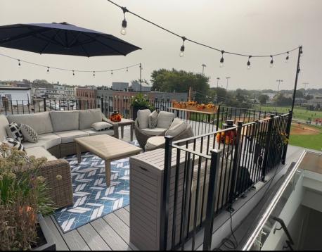 Penthouse unit available now! This stunning 2-bedroom, 2-bath residence features a private furnished rooftop with sweeping city skyline views and dedicated parking. Built in 2021, the building offers modern design and contemporary finishes throughout. The unit includes stainless steel appliances, in-unit washer and dryer, a cozy fireplace, and oversized closets with ample storage. Conveniently located near the Orient Heights T stop with easy highway access, this home combines luxury, comfort, and accessibility.
