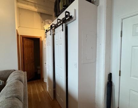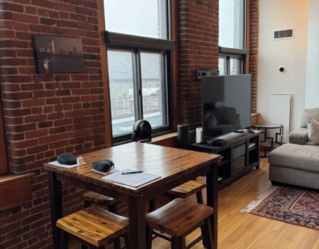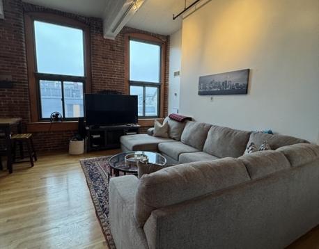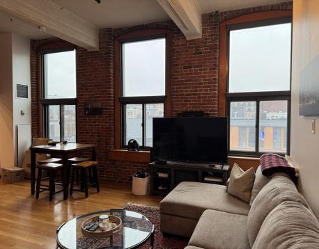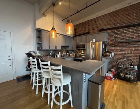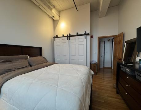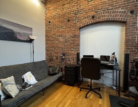 Spacious and sunny upper-floor open-plan loft at the Foundry with one bedroom, a large study and a full deeded parking space in a gated lot. Soaring 12' ceilings, huge windows with a southwest exposure, exposed brick and hardwood floors. Just minutes to the beach, Foodies Market, Stop & Shop, the Seaport District, the Broadway T-Stop, and all the restaurants and bars of South Boston. The kitchen has generous storage space a large breakfast bar, stone countertops, all stainless steel Bosch and Samsung appliances with a microwave and double-door fridge with ice maker. There is excellent closet space and additional storage within the unit. Central AC and heat are unit-controlled, and there is a large common laundry room, as well as bike storage in the building. The parking space is numbered C34. The Foundry is a professionally managed condominium building. Don't miss this one!