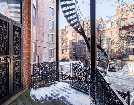 DUPLEX! This extraordinary one-bedroom condo, complete with a den or office that can serve as a second bedroom, is a hidden gem in the Back Bay. With its European charm, soaring 14-foot ceilings, original crown molding, and an abundance of natural sunlight, this space radiates warmth and elegance. The stained glass and stunning classic French marble mantel showcase artful craftsmanship. The separate dining or den/office area leads to a private patio, while mirrored walls create a sense of openness and brightness throughout. The kitchen, with its custom Italian red lacquer cabinetry and exquisite imported tiles, inspires culinary creativity. The master bedroom, complete with a full bath and ample closet space, offers a sanctuary of comfort, with additional storage on the lower level. Enjoy direct access to a private garden patio, featuring a unique iron spiral staircase that invites you to the deck off the main living area, seamlessly blending indoor and outdoor living spaces.