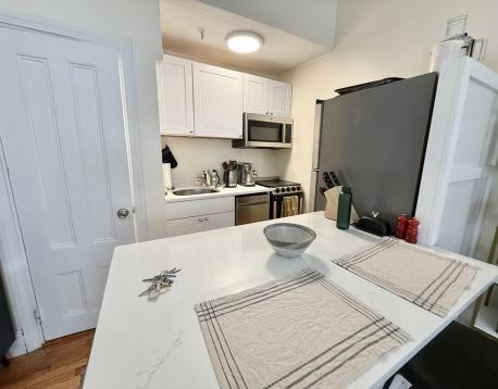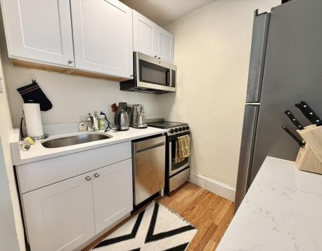 This penthouse one bedroom apartment has been renovated with quartz counters, stainless steel appliances, refinished hardwood floors, and a modern bath. Hot water is included in the rent and laundry facilities are in the building. Great Back Bay location close to Newbury Street, the Prudential Center, and Copley Square. Dogs ok.