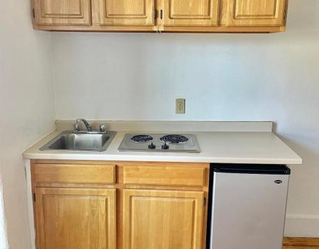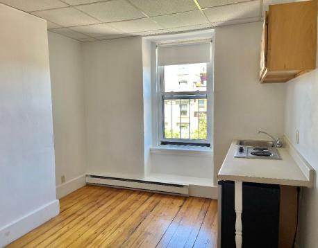 FURNISHED STUDIO WITH HARDWOOD FLOORS, A PRIVATE BATHROOM AND KITCHENETTE OVERLOOKING BEACON STREET.