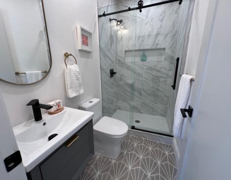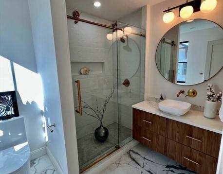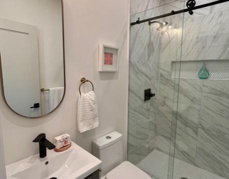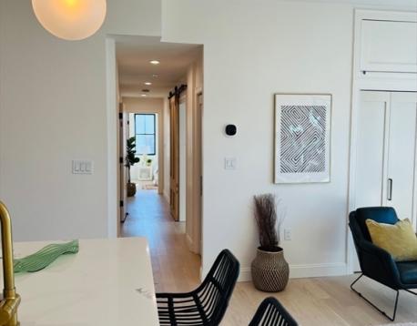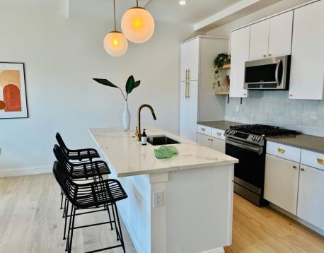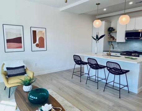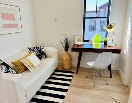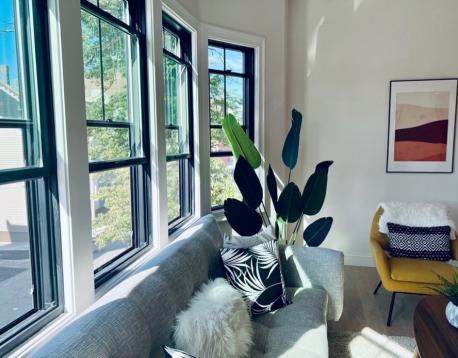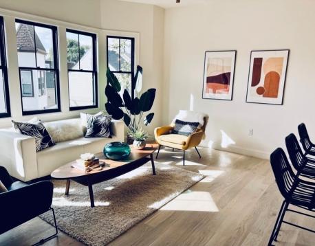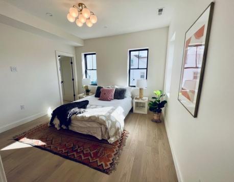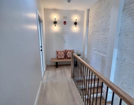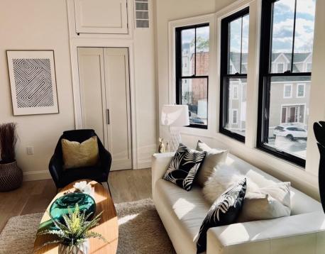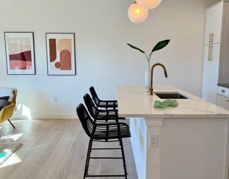 Avail. 7/1. Gorgeous condo for rent with tons of character such as its classic exposed-brick, gorgeous hardwood floors, black-framed windows, and stylish midcentury light fixtures. The expansive 5-bay windows enhance the modern open concept living/dining/kitchen area by providing ample natural light w/ southwestern exposures. The kitchen has plenty of cabinet and counter space with a double-sized pantry, quartz countertops, hand-crafted back splash tiles & an 8ft+ long kitchen island. The primary bedroom includes an extra large walk-in closet, a full bath with frameless shower and wall-mounted sink. Bedroom 2 has its own large closet and common full bath across the hall. Built in 1845 and recently renovated, this beautifully restored brick mansard embraces the architecture of its past while incorporating today's modernness w/ warmth! A storage room & in-unit w/d round out the unit's perks. Enjoy all that hot Eastie offers in this central location to amenities and transportation.