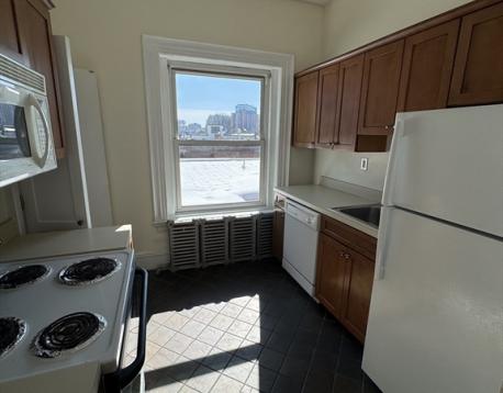 Enormous and sun-filled 1 Bedroom Split Condo in Audubon Circle / Fenway ready for immediate move-in! On the top floor of a regal condo building with an elevator, this unit boasts a spacious entryway, an oversized full bathroom, fully-equipped kitchen, and 2 XL rooms (2 bedrooms OR 1 living room and 1 bedroom). Each room is bigger than an entire studio apartment, and each room has tons of windows, catching both sunrise and sunset! This one-of-a-kind penthouse condo is perfectly located near Boston University, on the edge of Brookline, and around the corner from Longwood Medical Center. No pets allowed per condo association rules. Partially furnished with items shown in photos (removal of items can be negotiated). Plenty of street permit parking and dining options surround the building. Right off the D, C, and B train lines.