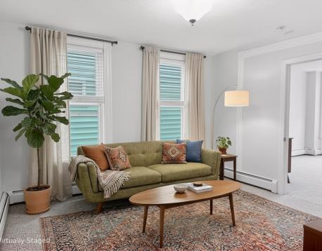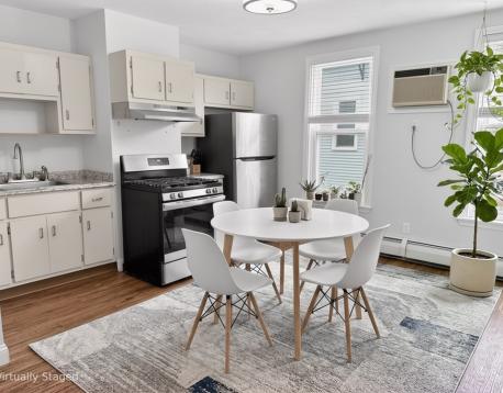 Desirable Jeffries Point Second-floor apartment for rent on the second floor. The unit features two bedrooms, an office, a living room, an eating kitchen, and one bathroom; wall-to-wall carpet, high ceiling, stainless steel appliances including a gas stove, refrigerator, hood, and one wall-mounted Air Conditioner. The unit is close to Boston Harborwalk, East Boston Shipyard, Piers Park, shopping, restaurants, parks, Maverick Train station, airport, I-93, Mass Pike, and 1-A. The first month's rent, last month's ren are due at lease signing. The building offer coin-operated washer and dryer in the basement. The apartment will be ready for occupancy on June 1, 2025.