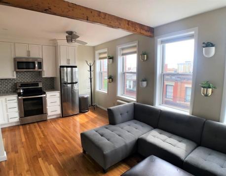 Available February 1! This renovated Beacon Hill condo is on the top floor of an elevator building. The living room features four bright windows, hardwood floors, and built in shelving with lighting. The modern kitchen has a dishwasher, microwave and ample countertop space. The bedroom faces the rear of the building and attaches to the stylish bathroom. The building has a beautiful common roofdeck and well maintained common areas. Steps from MGH, the Public Garden, Boston Common, Back Bay, and the shops and dining of Beacon Hill. The unit can be rented with or without the couch shown in the photo and laundry is available at the neighboring building. No undergraduate students. Dog friendly (no cats please). Heat and hot water included. First/security required.