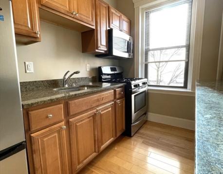 Charming, renovated studio apartment features gleaming hardwood floors, loads of natural light, and a functional layout- perfect for comfortable living. With thoughtful design elements, this studio offers a welcoming and contemporary atmosphere. The renovated kitchen is equipped with stainless appliances, rich cabinetry, granite counters (including a breakfast bar for dining or checking email), and gas stove. The bathroom with tile flooring has been tastefully updated and includes white surround tile, a large window, and a deep basin sink with vanity below. On-site laundry conveniently located in an elevator building. Incredible location across from the MBTA Green Line and in close proximity to Longwood Medical Center, hospitals, and universities. Restaurants, coffee shops, and Stop and Shop are just a short distance away. Heat and HW included. Great for the working professional. No students please. Easy to show! Available December 1, 2025 or January 1, 2026.