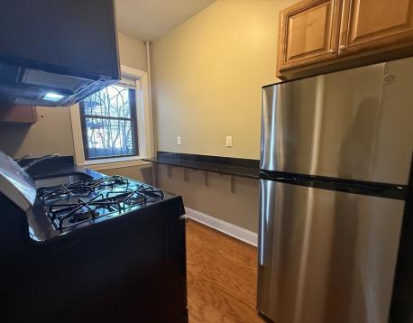 Charming, renovated studio apartment features gleaming hardwood floors, loads of natural light, and a functional layout- perfect for comfortable living. With thoughtful design elements, this studio offers a welcoming and contemporary atmosphere. The renovated kitchen is equipped with stainless appliances, rich cabinetry, granite counters (including a breakfast bar for dining or checking email), and gas stove. The bathroom with tile flooring has been tastefully updated and includes white surround tile, a large window, and a deep basin sink with vanity below. On-site laundry conveniently located in an elevator building. Incredible location across from the MBTA Green Line and in close proximity to Longwood Medical Center, hospitals, and universities. Restaurants, coffee shops, and Stop and Shop are just a short distance away. Heat and HW included. Great for the working professional. No students please. Easy to show! Available December 1, 2025 or January 1, 2026.