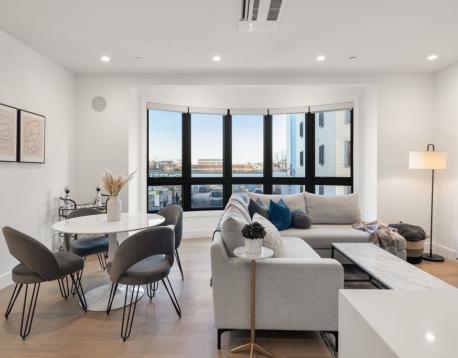 Enjoy luxury condo living at 75 on West. This impressive 2 bed residence was built in 2020 with striking architecture & high-end finishes. The complex is perched above Reunion Cafe at the corner of A St & W Broadway -- one of Southie's most prominent & bustling corners. Ideally located for city-dwellers, just one block from the Broadway T Stop & multiple highways with ease to Seaport, South End & Downtown. Floor-to-ceiling curved windows fill the space with natural light and showcase sweeping neighborhood views. The thoughtfully tailored open kitchen features custom cabinetry, under-cabinet lighting, waterfall quartz countertops & stainless steel appliances. The spa-like bath include sleek tiled shower, frameless glass enclosure, floating double vanity, and matte black fixtures. Building amenities include an elevator, shared gym, deeded storage & off-site garage parking. Additional features include keyless entry, intercom, surround sound, ductless mini splits & in unit w/d.