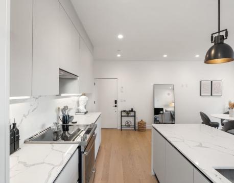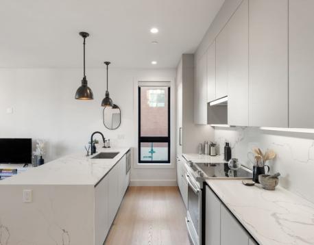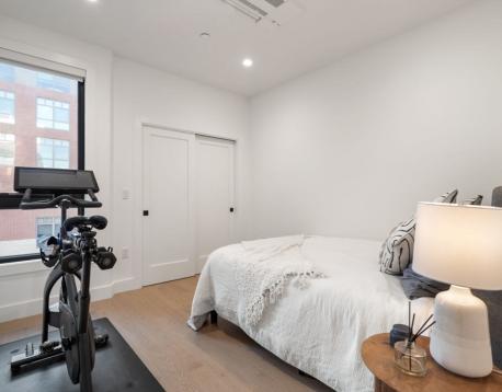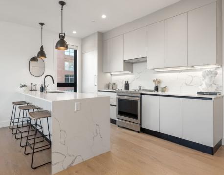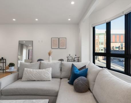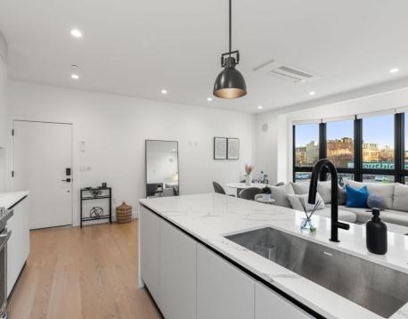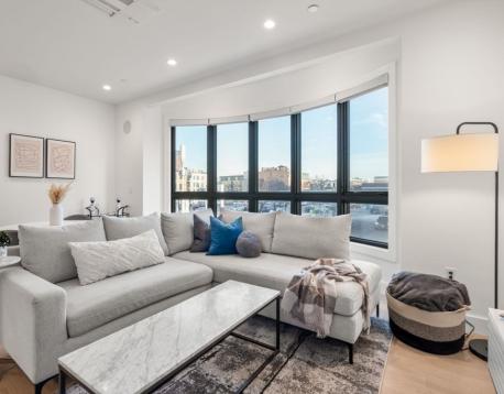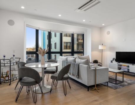 Enjoy luxury condo living at 75 on West. This impressive 2 bed residence was built in 2020 with striking architecture & high-end finishes. The complex is perched above Reunion Cafe at the corner of A St & W Broadway -- one of Southie's most prominent & bustling corners. Ideally located for city-dwellers, just one block from the Broadway T Stop & multiple highways with ease to Seaport, South End & Downtown. Floor-to-ceiling curved windows fill the space with natural light and showcase sweeping neighborhood views. The thoughtfully tailored open kitchen features custom cabinetry, under-cabinet lighting, waterfall quartz countertops & stainless steel appliances. The spa-like bath include sleek tiled shower, frameless glass enclosure, floating double vanity, and matte black fixtures. Building amenities include an elevator, shared gym, deeded storage & off-site garage parking. Additional features include keyless entry, intercom, surround sound, ductless mini splits & in unit w/d.