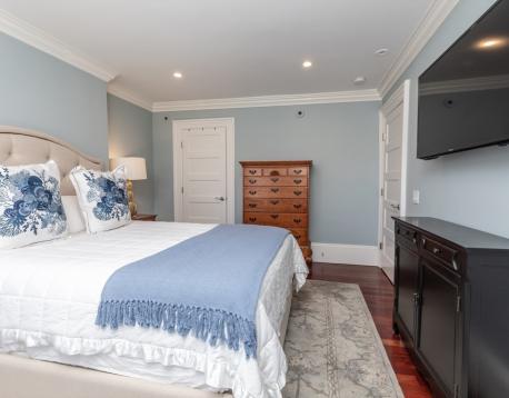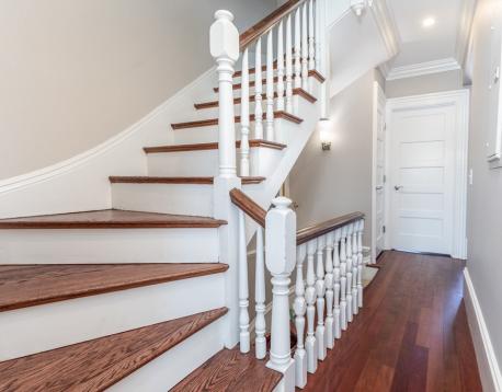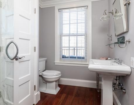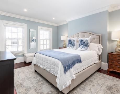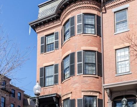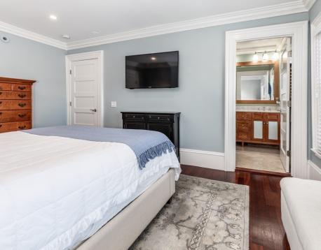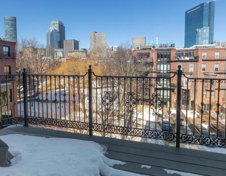 Furnished, sun-splashed 3-bedroom, 2 bathroom penthouse duplex at 83 Montgomery Street, offering the perfect blend of historic charm and modern comfort. A stunning new custom white kitchen features a panel-front refrigerator, gas cooking, and a spacious counter with bar stools, all open to the living room and formal dining room with custom built-ins for elegant storage and display. The open-concept main floor boasts high ceilings, multiple exposures, and seamless flow from kitchen and living areas to a large deck, creating an effortless indoor-outdoor lifestyle. Hardwood floors throughout, beautiful moldings, central A/C and in unit laundry. Upstairs, the tranquil bedroom level offers a queen-size primary suite, two additional bedrooms, and excellent closet space, along with access to an incredible private roof deck with sweeping views.