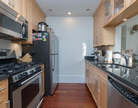 Experience the charm of this gorgeous second-floor condo on the highly desirable Montgomery Street at West Canton. Step into a sunlit living room featuring a decorative fireplace, South facing, open kitchen, complete with a breakfast bar, sleek granite countertops, stainless steel appliances, and gas cooking. Ideal for cooking enthusiastsThe home is outfitted with central A/C and showcases beautiful hardwood floors throughout, adding warmth and sophistication. The beautiful bathroom features a marble shower, and the in-unit washer/dryer adds ultimate convenience. The spacious bedroom opens to your own private balcony, where you can unwind and take in serene views of picturesque Hayes Park.