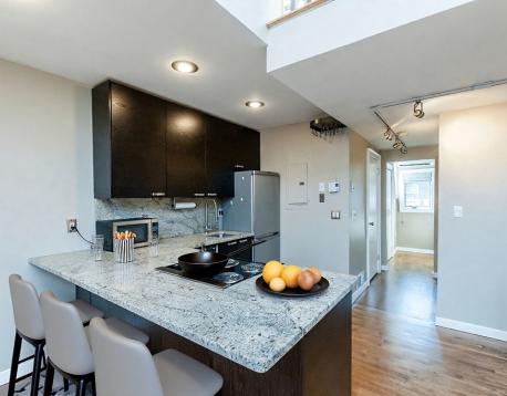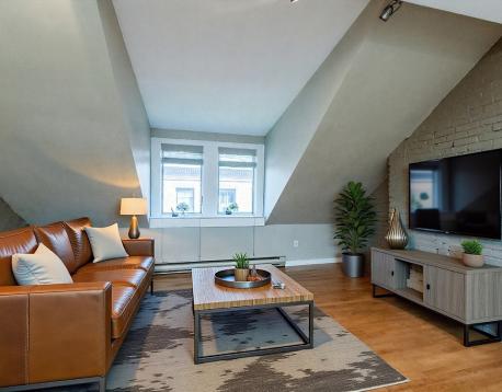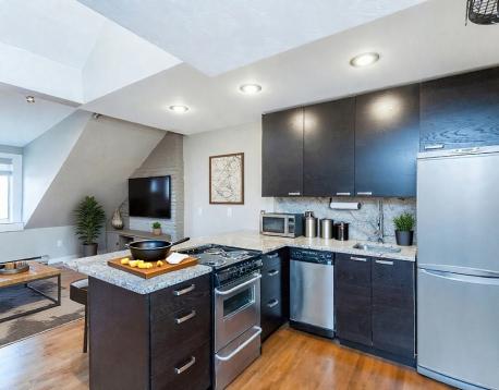 A chic loft-inspired penthouse in Bay Village, just steps to Charles Street and Boston Common & Public Garden. This bright & spacious 1BD/1BA apartment features hardwood floors throughout, vaulted ceilings and an upper mezzanine with skylights perfect for a home office or additional storage. A comfortable & efficient floor plan with a contemporary kitchen, delivered with stainless appliances, abundant pantry storage and granite counters that accommodate bar stools. The designer bath includes a pedestal sink and full-size tub & shower. The recessed bedroom rests under a skylight with adjacent storage compartments. Additional features: split-system A/C units, decorative lighting & FREE on-site laundry. Situated on a quiet, tree-lined street, the Bay Village neighborhood features red-brick rowhouses and borders Back Bay, South End & Theatre District - just beyond Tufts/New England Medical. Close proximity to multiple T-Stations, Commuter Rail and 93 & MA Pike ramps. NO pets, please.
