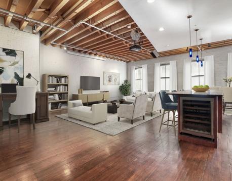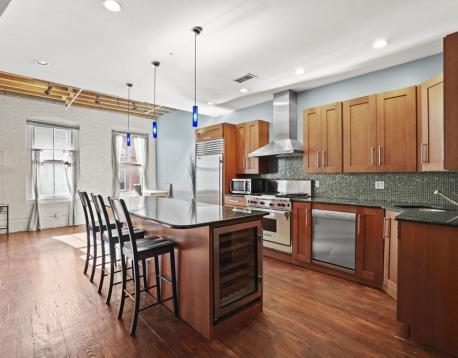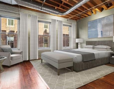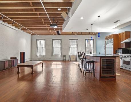 Exceptional loft in the Leather District featuring soaring 12-foot ceilings and an oversized front-facing window that fills the space with natural light throughout the day. This rare custom residence offers two spacious bedrooms and two beautifully finished bathrooms, wide-plank hardwood floors, and an ideal open-concept layout.The sleek kitchen is outfitted with high-end stainless steel appliances, including a Sub-Zero refrigerator, Wolf gas range, and a separate bar area with a Sub-Zero wine refrigerator. A fireplace anchors the intimate dining area, creating a warm and inviting space perfect for entertaining. The flexible floor plan allows for the potential addition of a third bedroom, home office, or gym, offering versatility to suit a variety of lifestyles.