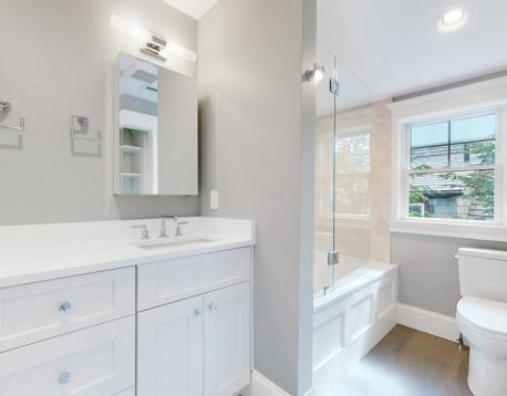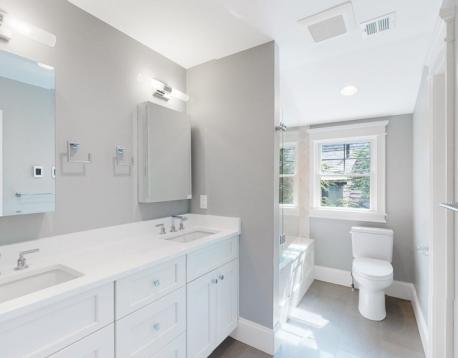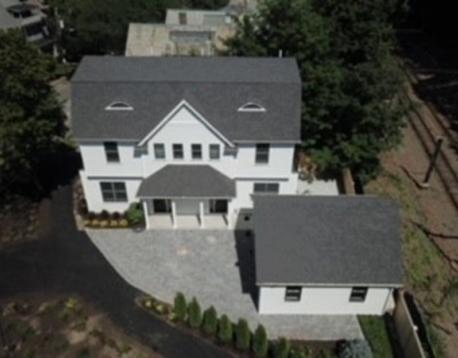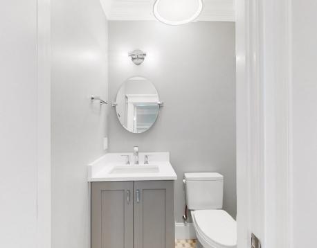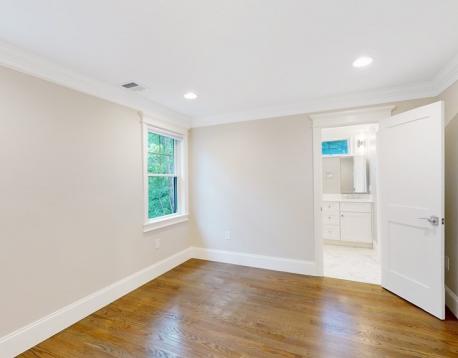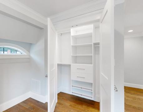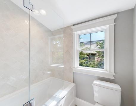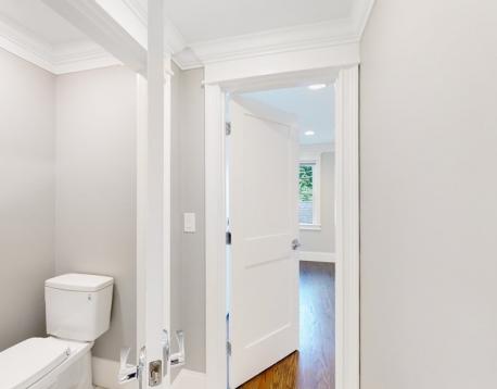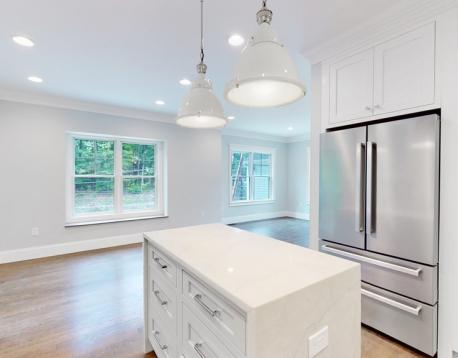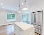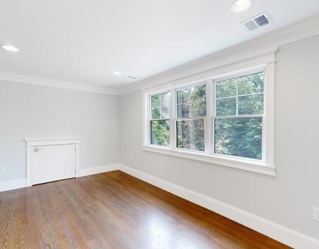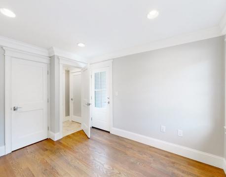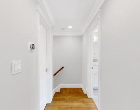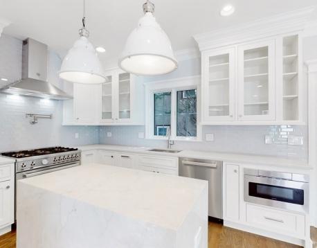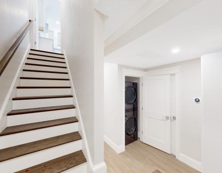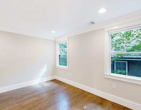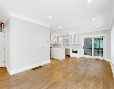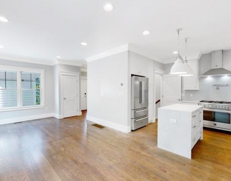 This exquisitely designed townhouse, by architect, Henry Bobek, and built by Pat Corrigan while keeping the charm and appeal of the surrounding neighborhood. As you step into the residence, you are welcomed by a stunning foyer characterized by red oak flooring and crown moldings throughout. To the left of the foyer, an open-concept space unfolds, combining the kitchen and dining area. Oversized windows grace this space, allowing an abundance of natural light to saturate the surroundings. The kitchen, a haven for culinary enthusiasts, showcases custom-crafted cabinetry that seamlessly marries functionality and style. The aesthetic is completed with luminous white quartz countertops, which complement the top-of-the-line Bertazzoni stainless steel appliances adorning the space.Adjacent to the kitchen and dining space, the living room beckons with its allure.
