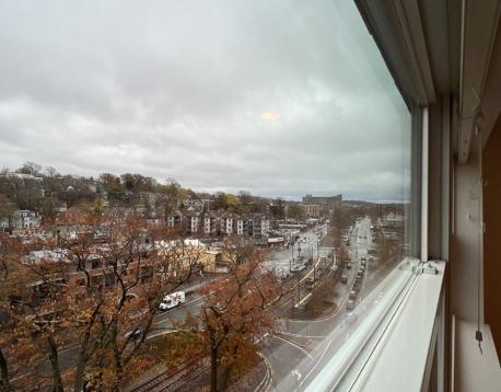 Corner unit and Southeast facing 2-bedroom 2-bathroom condo in a renovated building of Washington on the Square. Just completely professionally re-painted. On the high 10th floor with elegant flows and throughout hardwood floors, this unit has a beautiful oversized living room with big windows overseeing city views far and near. Modern granite cherry kitchen has a breakfast peninsula, extra storage and new refrigerator. Both sunlight filles and spacious bedrooms are in comfortable size to live and entertain. Complex offers new exercise room, new hallways, lobby and much more. Ideally located in the most-sought location in Brookline, its a "Walker's Paradise" to many places including Coolidge Corner shops and restaurants. Easy transit to both Boston University and Boston College via public transportation. Heat, hot water, 1-car garage parking and many other amenities are included in the rent.