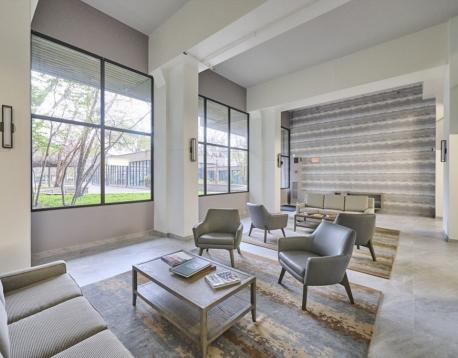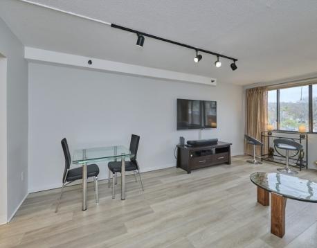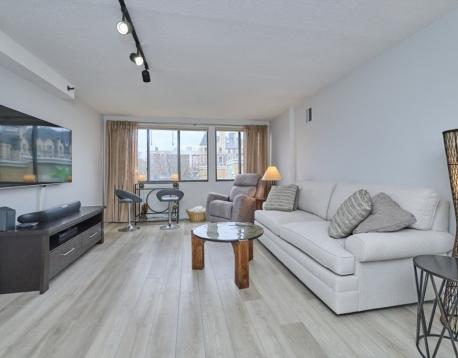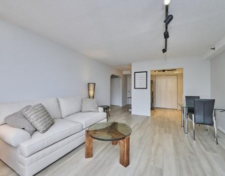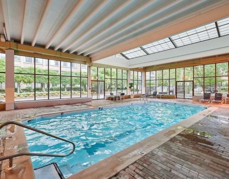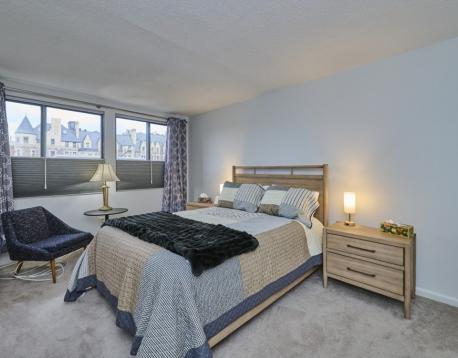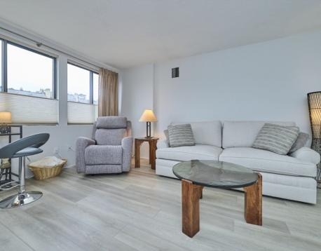 Washington Square, Brookline. Inviting one bedroom apartment in modern concrete and steel condo building with elevator. Open living and dining area with new engineered wood-like floors and freshly painted throughout. The carpeted bedroom is spacious enough for a king-size bed and offers a walk-in closet. The bathroom is complimented with a new vanity. The building hosts many amenities including 24-hour concierge, an indoor pool, library, game room, gym, outdoor patio with grills and concierge. Full-size garage parking for one car is also included. The green line is right outside the front entrance as are shops and restaurants. Option to rent unfurnished for $3,000 per month or furnished for $3,400 per month. Available now!