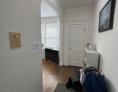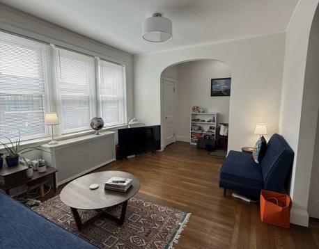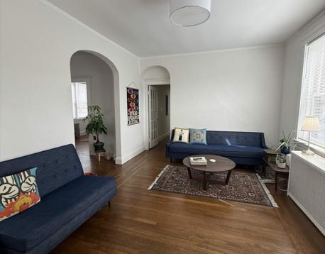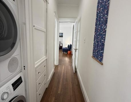 Sun-filled, top-floor 2 bedroom condo with1 rental parking space. Set back from Washington Street by a lush courtyard, this stylish unit offers updated kitchen, gracious room proportions, high ceilings, hardwood floors, ample closets incl. master bedroom walk-in, in-unit laundry, built-ins, screened porch, & large storage area. Fantastic location close to Coolidge Corner, Wash.Sq, Brookline Village, Longwood Medical area, elementary & high schools, several parks, & the library. Near C/D lines. Extra storage in the basement.