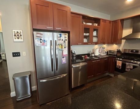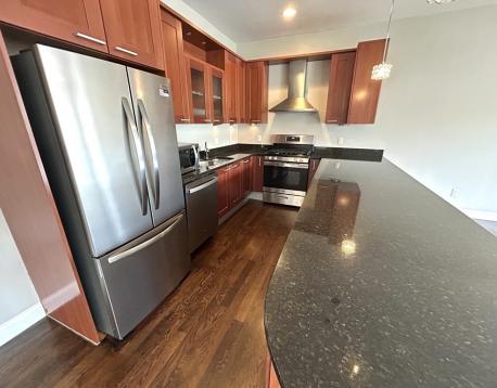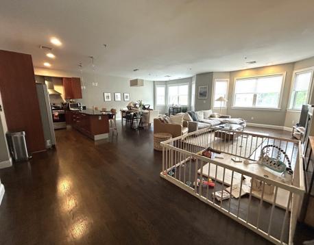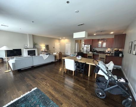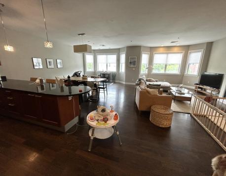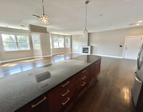 Built in 2003, this penthouse unit is conveniently located in Brookline Village with easy access to the MBTA Green Line and the Longwood Medical Area. The exceptionally spacious open great room (1,446 sq ft) features bright southern exposure. The family room includes a fireplace and bay windows that open to the dining room. The modern kitchen features granite countertops, stainless steel appliances, and a large breakfast bar. A hallway leads to the private bedroom area and in-unit laundry. The spacious primary suite includes a walk-in closet. An equally spacious second bedroom and a second full bathroom are located in the hallway. The unit also includes one covered parking space. Available now with flexible lease start dates (5/1, 6/1, or 7/1/2026). Please reach out for additional details.