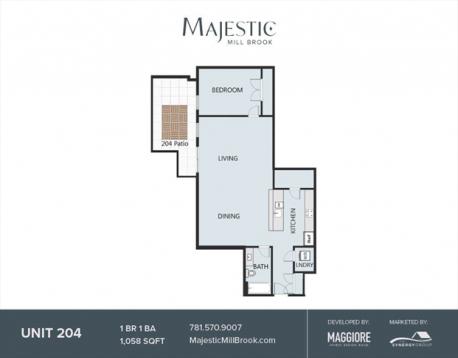 OPEN HOUSE Th/Fri/Sat 11-2pm. One of the only two remaining 1 bedroom residences with a private patio at Majestic Mill Brook, a luxury new construction condo complex built by The Maggiore Companies. Low-emissions development with high-quality finishes and contemporary flair. The stylish interiors feature an open concept living room, dining room, and kitchen with electric range, exterior vented exhaust hood and microwave drawer. This unit features a courtyard level private patio, leading to community courtyard featuring grilling stations, comfortable seating and lush plantings. Additional community amenities include a 5th floor roof deck, ground level Urban Garden and community fitness center. Enjoy everything Arlington has to offer from the Minuteman Bikeway only 0.2 miles from Majestic, to endless dining, shopping and recreational activities. 1 deeded garage parking space, bicycle storage & storage unit. Pet friendly. Private EV chargers.