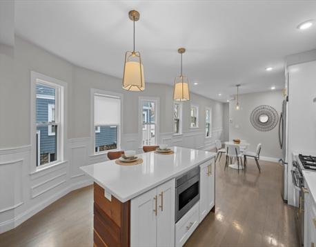 Ideally located on a quiet, tree-lined street in sought-after East Arlington, this beautifully updated 4 bed, 3 bath condo offers over 2,100 sq ft across two levels. Moments to Arlington Center, Mass Ave, public transportation, and the Minuteman Bikeway with easy access to Cambridge/Boston. The main level features a sun-filled living/dining area and a designer kitchen with quartz countertops, custom cabinetry, and a 36” Bertazzoni range. Spacious primary suite with custom closet, en suite bath, plus an additional bedroom and full bath. The lower level offers two bedrooms, full bath, and a versatile family room ideal for guests, or additional living space. Enjoy central air, a Navien tankless hot water system, private outdoor space, garage parking, and additional off-street parking. Close to shops, restaurants, parks, and Spy Pond. Welcome Home!