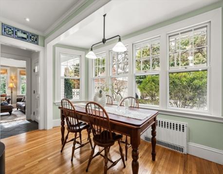 The Frank W. Wunderlich House (c.1895) is a Colonial Revival Craftsman that captures the grandness & stature of late 19th-century homes. Situated on a prominent corner lot in Jason Heights, close to Menotomy Rocks Park, this distinguished home has been lovingly maintained & updated by the owners to a very high standard. With 4 bedrooms & 3.5 bathrooms, a gracious foyer welcomes you & sets the tone for the scale & original details throughout. The living room is bright & spacious with custom built-ins & a stunning fireplace, while the formal dining room is ideal for special gatherings. The renovated kitchen is stunning and the focal point of the home, featuring Thermador double ovens, cooktop, & downdraft vent, overlooking the fenced-in rear yard, making it perfect for cooking and entertaining. A private den offers a cozy space for family time, & a two-car garage adds convenience. With so many exquisite details, the full charm and character of this home must be experienced in person
