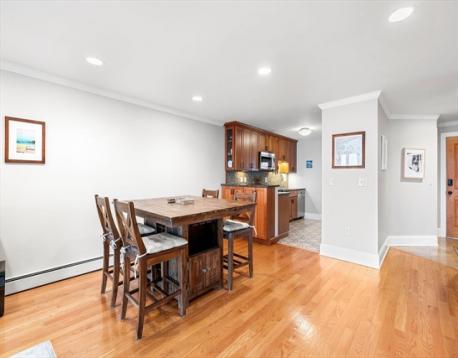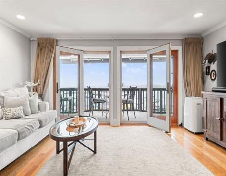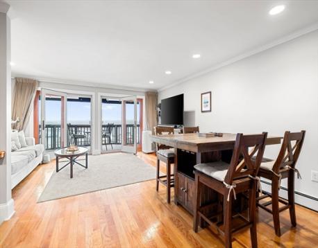 This spacious townhome offers a refined coastal lifestyle with harbor views from private decks on every level. The open-concept main floor features a kitchen with shaker cabinetry, stone countertops, and a stylish peninsula that flows into a bright living area accented by classic crown molding. A dedicated home office and guest half-bath complete the main level. The primary suite serves as a peaceful retreat, boasting two large closets, a private balcony, and a spa-like bath with radiant heat flooring and a tiled walk-in shower. Complete with a second bedroom, in-unit laundry, and assigned parking, this elegant home is just a short walk to the commuter rail, beaches, and the vibrant shops and restaurants of downtown Beverly.