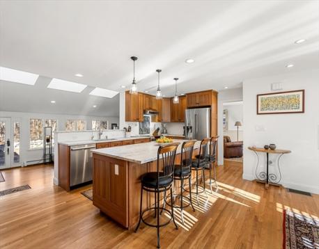 On a Beverly Cove cul-de-sac, 6 Tall Tree Drive feels like a private well designed retreat. The heart of the home is sunny with an open kitchen grounded by honed granite, breakfast bar, induction stove, stainless appliances, and naturally flows into the dining area and sky-lit family room. For quiet moments, the front-to-back living room features a gas fireplace and opens to a screened porch—an inviting summer refuge. The intuitive layout includes a private 1st floor office with yard entrance and a sun-drenched studio with vaulted ceilings and windows on all sides. 1st floor laundry with built-ins keeps life organized. HW floors & storage. Ready for the future, the owned solar with battery backup and heat pumps provides comfort and significant savings. Upstairs are 4 spacious bedrooms, including a primary ensuite. The private yard offers room to garden, play and relax with Fox Hill trail access just 2 doors away. Close to beaches, parks and the energy of the Cabot Street Arts district.
