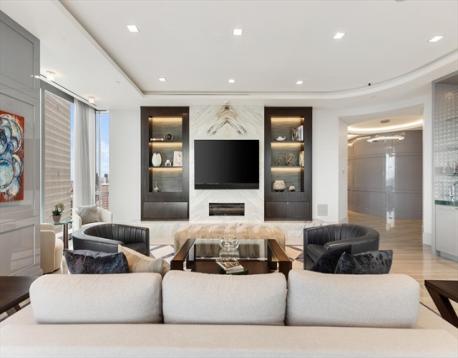 Four Seasons Private Residences at One Dalton, This exceptional 3-bedroom, 3.5-bath home commands sweeping, front-facing Charles River views. Spanning over 3,200 square feet, this home was meticulously customized by Sanborn Custom Builders and showcases floor-to-ceiling windows capturing dramatic panoramas of Back Bay, Cambridge, and the most unforgettable sunsets. Refined interiors feature a striking custom fireplace with a marble-clad feature wall, designer lighting, and elegant porcelain flooring throughout. Enjoy private elevator access with no shared foyer leading to expansive living and entertaining spaces that flow seamlessly into a bespoke gourmet kitchen with an rarely offered additional family room. Residents enjoy legendary Four Seasons white-glove services, access to the exclusive 50/50 Club, a 65-foot heated lap pool, spa, state-of-the-art fitness center, golf simulator, private theatre, pet wash, and dining at the renowned Zuma restaurant. 2 Valet Parking