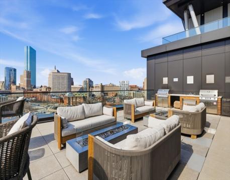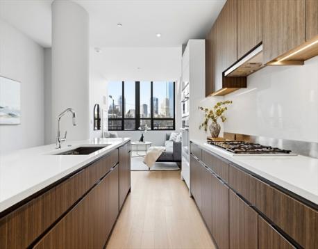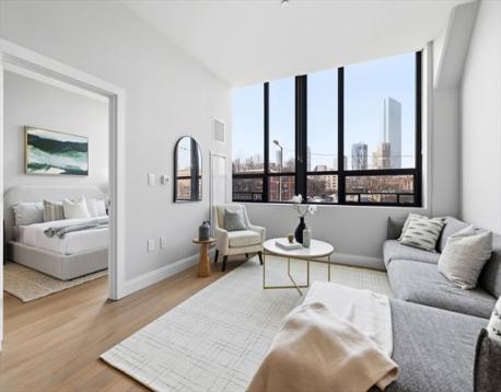 This exceptional oversized one-bedroom residence features a one-of-a-kind floor plan within the building, with soaring 9+ ft ceilings, oversized windows, and sweeping panoramic views of the Boston skyline, plus garage parking. The bright open living and dining area offers generous space for both entertaining and everyday living, with additional room for flexible use such as a home office or den. The modern kitchen is outfitted with custom cabinetry, Miami White Silestone countertops, and premium Thermador appliances. The spacious king-sized bedroom includes a custom built-in, walk-through closet leading to a spa-inspired bathroom with double vanity. Ideally located steps from Whole Foods, renowned South End dining, and convenient access to public transit as well as I-90 and I-93. Residents enjoy luxury amenities including 24/7 concierge, on-site management, coworking lounges, caterer’s kitchen, two rooftop terraces with skyline views, pet spa, and more. Best value in the building!
