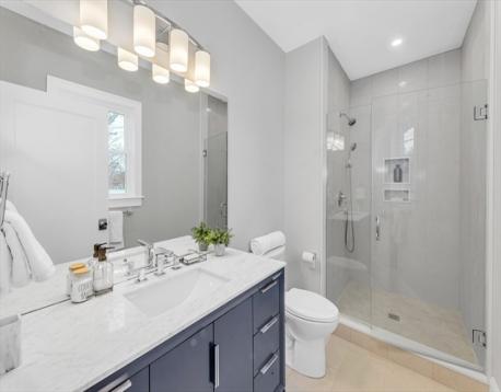 Bright, beautifully renovated, and truly spacious—this move-in-ready Roslindale condo lives like a home. Three generous bedrooms PLUS a sunlit front office with porch access deliver real flexibility for WFH, guests, gym, or playroom. A private primary suite features great closets and an en-suite bath with a sleek shower. The open-concept kitchen is the centerpiece with GE Café appliances, chef-style gas range, and a breakfast bar that seats four—perfect for entertaining. Hardwood floors, updated systems, and high-efficiency heating & cooling bring modern comfort with low-maintenance ease. In-unit laundry, garage parking + an additional outdoor spot, and shared common outdoor space. Plenty of storage with pull-down attic storage plus dedicated basement storage.