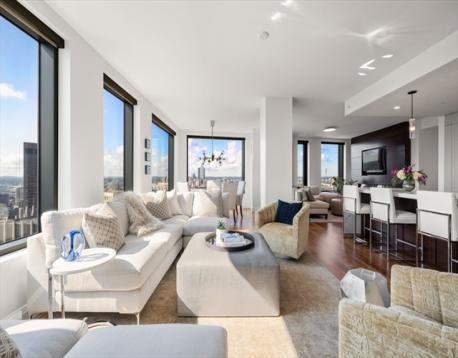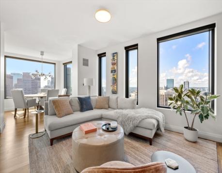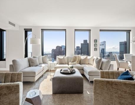 Take in unbeatable panoramic harbor & river views from every room of this customized 40th fl home in the south corner of The Sudbury tower boasting 3 exposures, bathed in natural light. A 30' wide living space is anchored with a custom 15ft. Carrara quartz & walnut waterfall island in the open concept kitchen w/ Scavolini cabinetry, integrated Gaggenau appliances, vented gas cooktop, & wine cooler. A large den doubles as a 3rd bedroom. Custom walnut media wall. Motorized blinds & glare-treated windows throughout. Radiant heated floors in primary ensuite bath. Vented dryer & baths. Amenities: private lobby, 24/7 concierge, private clubroom & private roof garden. Heated outdoor pool, 4500sf fitness center/yoga studio, sports simulator, outdoor dog park, sky lounge/deck, chef’s kitchen/private dining & more. Located where the North End meets Beacon Hill. Steps to Greenway & Harborwalk .1min to I-93; 5min to Logan. 2 assigned self-parking in attached garage upgraded w/ dual arm EV charger.