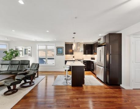 Introducing a standout luxury residence defined by an extraordinary open-concept living space rarely found in South Boston. This 1,449 sq. ft. floor-through three bedroom home features a seamless living, dining, and kitchen layout ideal for both entertaining and everyday living. Oversized windows capture skyline views and fill the home with beautiful natural light. The modern chef’s kitchen offers custom cabinetry, high-end stainless steel appliances, and a waterfall quartz island. The primary suite includes a custom closet and spa-inspired en-suite bath. A spacious second bedroom and a highly desirable 3rd flex/office provide excellent versatility. Additional highlights include gleaming hardwood floors, a private rear deck with city views, and 1 deeded garage parking space. Ideally located steps from South Boston’s top dining, shopping, and neighborhood amenities.