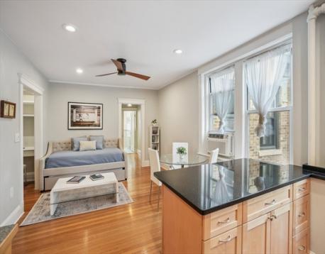 BRIGHT AND SUNNY PENTHOUSE Corner Unit in Prime Fenway Location! This large top-floor 1-bed+ FULLY FURNISHED unit in a professionally managed, elevator building features high ceilings, an open floorplan, unique separate office space, hardwood floors, recessed lighting, and ample storage & windows throughout. Kitchen offers granite island breakfast bar, gas cooking, birch cabinets, and dining space open to large living room with new ceilings, recessed lighting and fan. Oversized bedroom includes walk-in closet and ceiling fan. Bathroom has been thoughtfully renovated, with tub/shower combo and tiled surround. Unbeatable location- set back from street & close to trains & bus lines, Fenway Park, Time Out Market, shops/restaurants of Fenway, Longwood Medical, and multiple universities. LOW HOA FEE INCLUDES HEAT & H/W- Perfect for investor or owner-occupant! Laundry, bike room and additional secure storage on site. AVAILABLE FULLY FURNISHED, INCLUDING PLATES AND SILVERWARE- MOVE RIGHT IN!