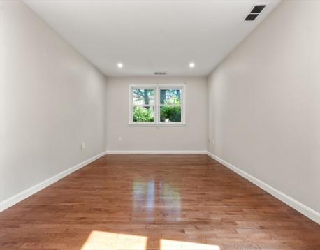 NO SPECIAL ASSESSMENTS!!! Welcome home to this bright, spacious first floor West Roxbury condo, offering an open floor plan with two generous bedrooms & two full baths. The inviting sunken living room features a wood-burning fireplace & a sliding door leading to your own private, covered deck—perfect for relaxing or entertaining. The oversized primary suite boasts an attached full bath & two large closets. The guest bedroom also offers ample storage with double closets, plus easy access to the second full bath & convenient in-unit laundry. Recent updates include new stainless steel appliances, updated bathroom vanities, modern lighting,& fresh paint throughout. Covered private deck with storage. Additional features include hardwood floors, central heating & air conditioning, & an oversized (5’x9’) private storage unit in the basement. This property is ideally located approximately 1/2 mi from the commuter rail, providing quick access to downtown Boston.