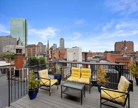 Well Maintained top floor Penthouse unit located in Backbay on the first block of Beacon Street with a 450+-sf Private Roof Deck which offers picturesque views of Back Bay, Fenway, Cambridge & Beyond. 10/10 Excellent location, steps to the Boston Public Garden, Esplanade & steps to Newbury Street. This home offers charming original detail like arched windows, hardwood floors & high ceilings. Living room features a marble decorative fireplace, perfect for those winter nights. Newer kitchen offers custom cabinets, SS Bosch appliances, counter depth fridge, induction cooktop, granite countertops & marble tile back splash. Spa style marble bathroom with new glass shower door and rain head fixture. Central A/C & in unit Bosch laundry. A spiral staircase in your study leads you to your own private roof deck with amazing views. schedule a showing and come to enjoy the views. No elevator in building.