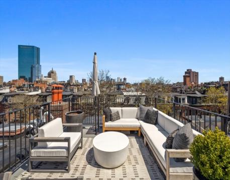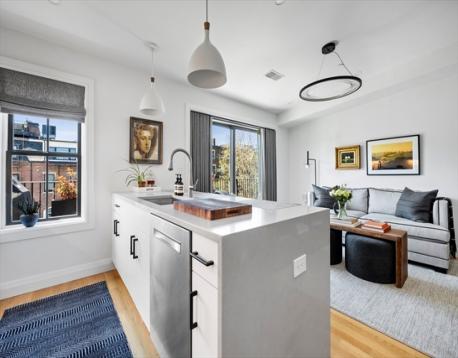 Newer construction penthouse on one of the South End’s most sought-after streets. Constructed in 2020 by a respected local builder, this top-floor 2-bed home pairs clean design with exceptional light and offers an unusual amount of private outdoor living. The sleek and modern kitchen is equipped with stainless appliances, gas cooking, and generous bar seating and opens seamlessly to the living area, where a wall of glass leads to an expansive west-facing deck with iconic Back Bay views. Two bedrooms, including a king-sized primary with a walk-in closet, share a thoughtfully finished bath. A private 300+ sq ft roof deck, accessed by a full staircase, delivers sweeping pano views of Back Bay + downtown, ideal for effortless entertaining in the warmer months. High ceilings, central Heat/AC, in-unit laundry, and hardwood floors complete the home. Prime location on one of the neighborhood's favorite streets, this home is situated in the heart of the South End.
