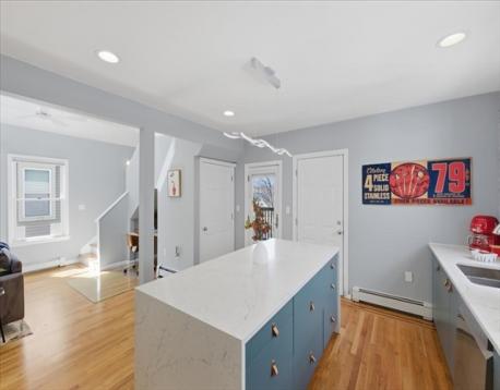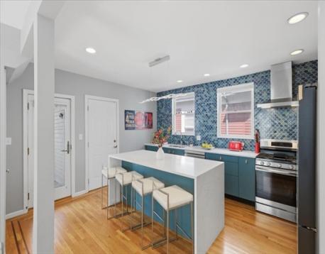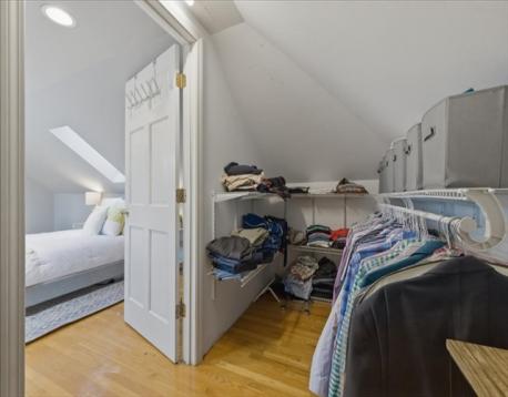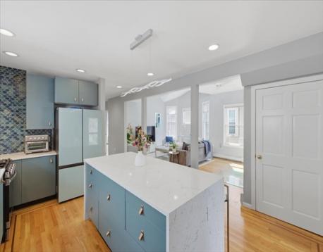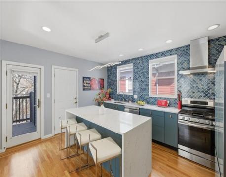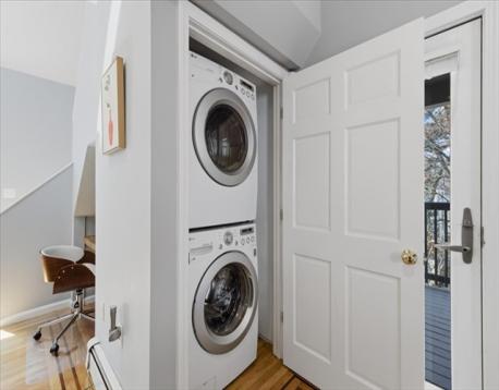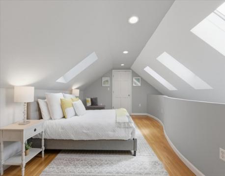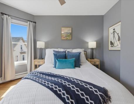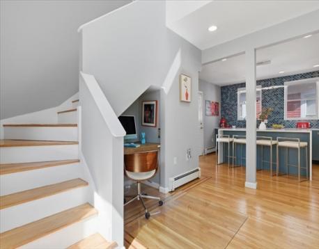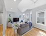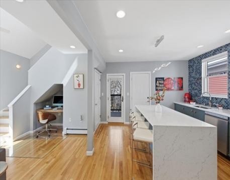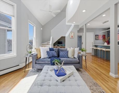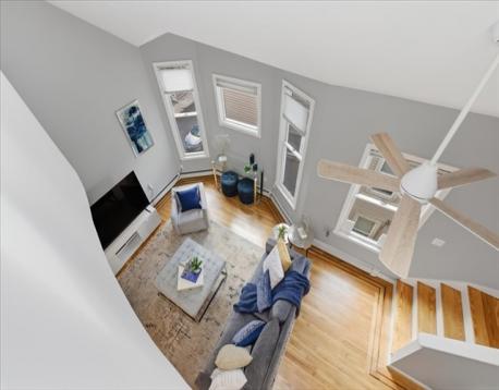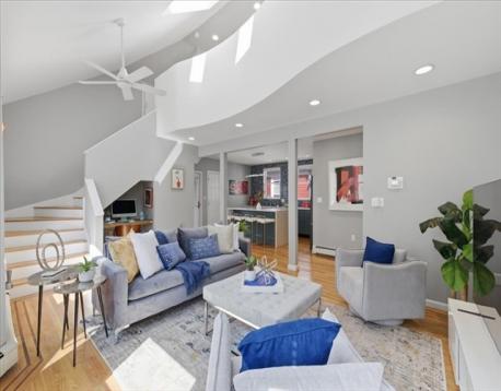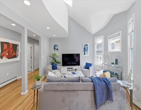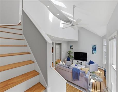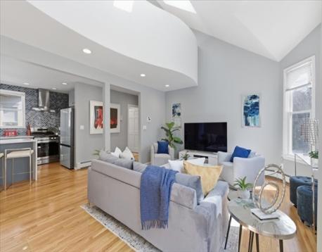 Offer deadline Tuesday 3/31 at noon! Stunning loft-style third-floor condo in the heart of JP offering 1,200 sq ft of sun-drenched living space. This unique home features a dramatic open floor plan with soaring vaulted ceilings, multiple skylights, and a beautiful blend of period Art Nouveau curves and striking Art Deco window lines that flood the space with natural light. Oak flooring with inlaid walnut accents and recessed lighting. Entertainer's paradise! The living area flows seamlessly into a designer kitchen featuring a gorgeous tiled accent wall and a waterfall island with seating for four. Enjoy outdoor living on the oversized covered back deck. The main level includes a spacious bedroom with large walk-in closet, while the loft offers a second expansive bedroom with walk-in closets. Additional highlights include in-unit laundry, private basement storage, and a brand-new gas heating/hot water system. Shared backyard patio area. Easy access to bus/train, shopping & restaurants.