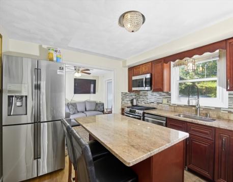 Discover the inviting residence located in the lovely and convenient neighborhood of Hyde Park . The home boasts approx. 1900sq ft of living space. The kitchen presents an open invitation to culinary exploration, featuring a large kitchen island perfect for both preparation and casual dining, stone counter-tops offering durability and elegance, shaker cabinets providing ample storage, and a stylish back splash all creating an inspiring area for memorable meals. In one of the three spacious bedrooms, a skylight introduces natural light that warms the space.The home offers 2 full baths and one half bath. The property features an open floor plan, ideal for both entertaining and everyday living. Stepping outdoors, a deck provides a private space for relaxation and enjoyment of the surrounding environment. The finished basement offers great ADU potential by right in the city of Boston. Newer solar has added benefit of cost savings and energy efficiency. First showing 10/12/25 11:30am - 1pm