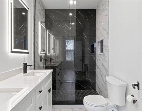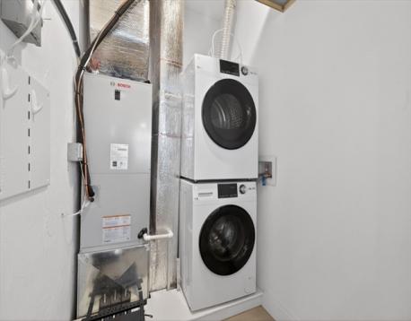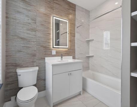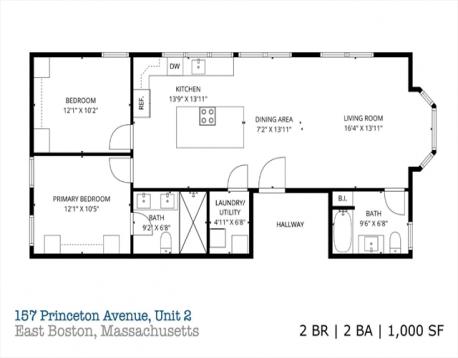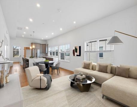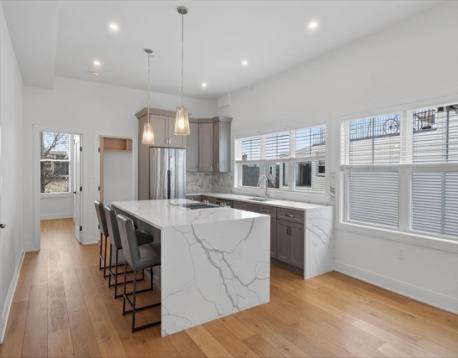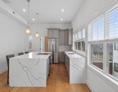 Come see it before it’s gone! One-of-a-kind 2 bed, 2 bath corner unit offering 1,050 sq ft of beautifully renovated living space, complete with a rare off-street parking space. This sun-drenched home features a modern open-concept layout with soaring ceilings, hardwood floors throughout, central A/C, custom wood blinds, and abundant recessed lighting. The thoughtfully designed kitchen showcases sleek gray-toned cabinetry, quartz countertops, and a striking waterfall island, with all appliances included. Both bathrooms are tastefully finished with porcelain tile, quartz countertops, high-end fixtures, and LED anti-fog mirrors, while both bedrooms offer custom European-style wardrobes. Additional highlights include an in-unit laundry/utility room and dedicated basement storage. Ideally located near the Blue Line with easy access to downtown, parks, and shops. Close to top East Boston dining including Angela's Cafe, Rino's Place, Santarpio's Pizza, and Mida.