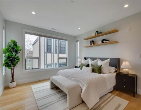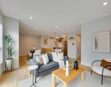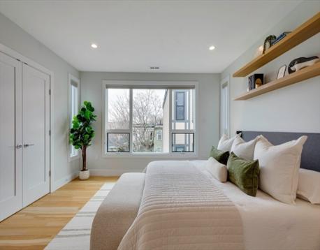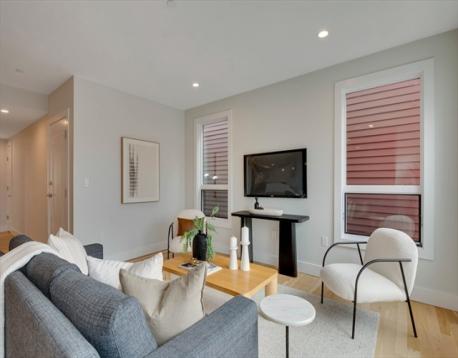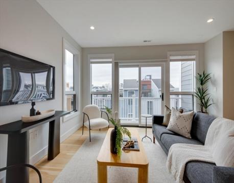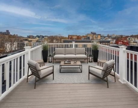 Discover refined South Boston living in this stunning top-floor 2 bedroom, 2 bathroom penthouse condo, highlighted by a private staircase leading to your exclusive roof deck with sweeping city views. Step into an open-concept living area drenched in natural light, offering generous space to furnish and entertain, complemented by a rear porch that brings in fresh air and extends your living space. The modern kitchen features sleek cabinetry, quartz countertops, stainless steel appliances, a Kraus deep sink, Delta faucet, and pendant lighting over the breakfast bar. Both bathrooms showcase matte black finishes, with the main bath offering a tub/shower and the primary suite featuring dual floating vanities and a glass-enclosed walk-in shower. Oversized 5.5 ft windows brighten the bedrooms, each offering excellent closet space. With in-unit laundry and parking included, this penthouse delivers style, comfort, and a rare private rooftop sanctuary.